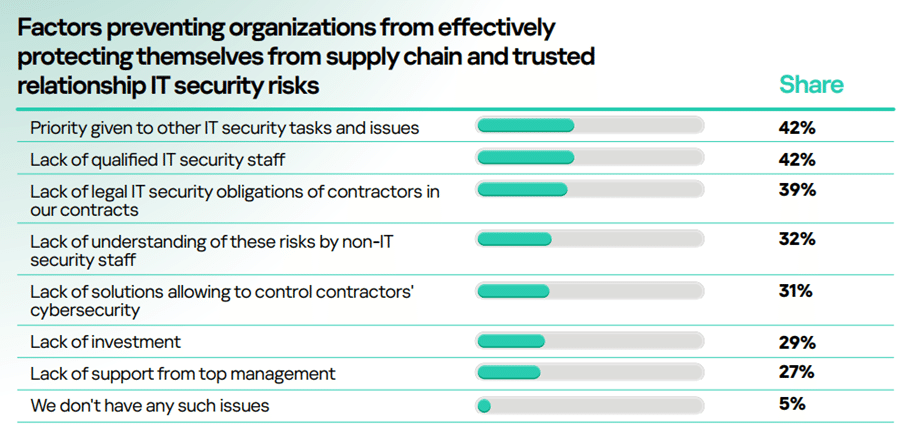 Kaspersky’s recent study[1] on supply chain and trusted relationship risks showed that supply chain attacks have emerged as a top threat for businesses, with every third organization hit by such an attack over the past year. The severity and frequency of supply chain attacks necessitates uncovering the key reasons preventing them from addressing the risks successfully.