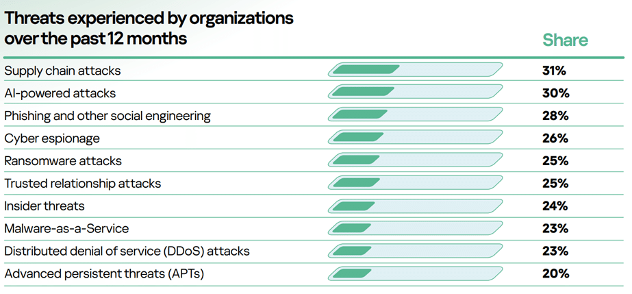 Supply chain and trusted relationship attacks are among the most common threats, yet the survey showed many leaders tend to underestimate them. When asked to classify threats by how dangerous they seemed, organizations focused on complex attacks like Advanced Persistent Threats (APTs), ransomware or insider threats, rather than the ones they actually face most often. Only 9% of businesses globally ranked supply chain attacks as their top concern, a strikingly low level of attention given how often these threats disrupt their operations. Similarly, just 8% named trusted relationship attacks.